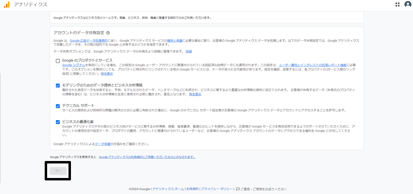 アカウントのデータ共有設定は、内容を閲覧して、共有したい項目があればチェックを入れて、不明な場合はデフォルトのままにしておき、「次へ」をクリックします。