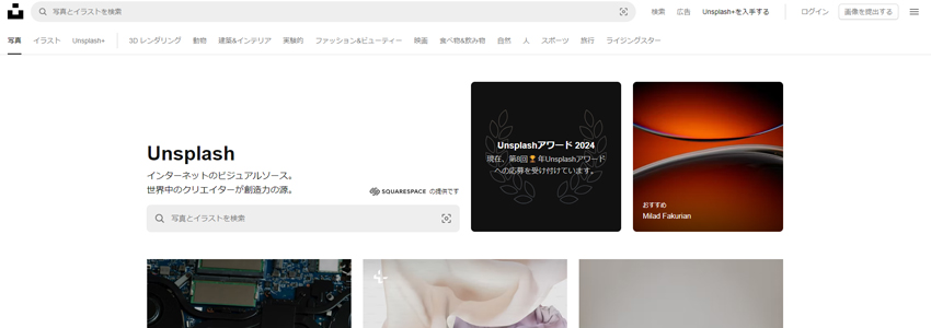 Unsplashでは、300万点以上の写真素材が揃っており、さらにユニークな検索機能も魅力のひとつです。例えば、画像をアップロードすると、それに似た写真を探すことができる機能があり、直感的に素材を見つけることができます。