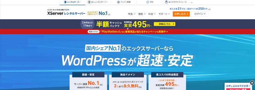 エックスサーバーでは、新規契約者向けに期間限定の割引キャンペーンや無料ドメイン特典などが定期的に実施されています。